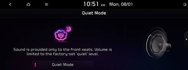 Radio/media is played only in the front seat in this mode. To turn on quiet mode press Quiet Mode. Press again to switch off.