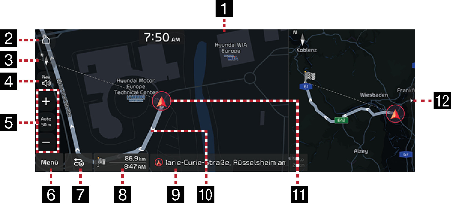 Der Kartenmaßstab wird automatisch an die Geschwindigkeit, Straßenkategorie und Zielführungsdistanz angepasst. |