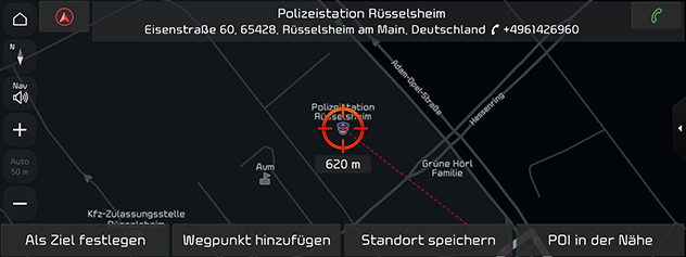 Den Punkt auf der Landkarte gedrückt halten, in die gewünschte Richtung ziehen und dann loslassen, wenn der gewünschte Punkt fokussiert ist. Die ausgewählte Stelle erscheint in Bildschirmmitte, und das Bildlauf-Symbol wird angezeigt. In der Mitte des Bildschirms werden Informationen über die markierte Stelle sowie die Luftlinienentfernung zwischen dieser Stelle und der aktuellen Position angezeigt.