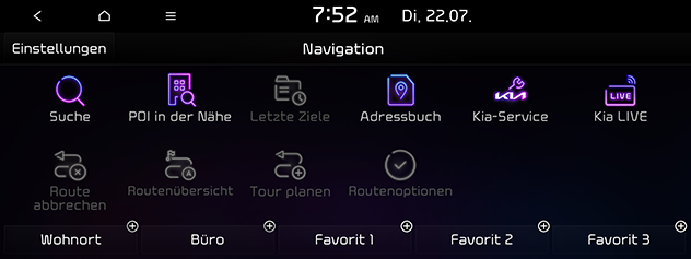 Route: Sucht nach Kia-Diensten entlang der aktuellen Route. Nur verfügbar, wenn das Ziel festgelegt ist.