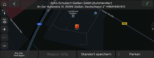 Karten- zentrum: Sucht nach Kia-Diensten im Umkreis der Bildlaufmarkierung. Nur verfügbar, wenn der Kartenbildschirm gescrollt wird.