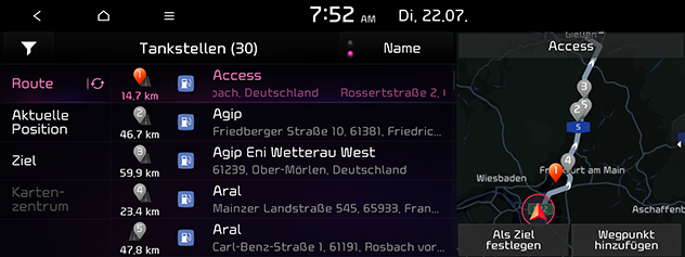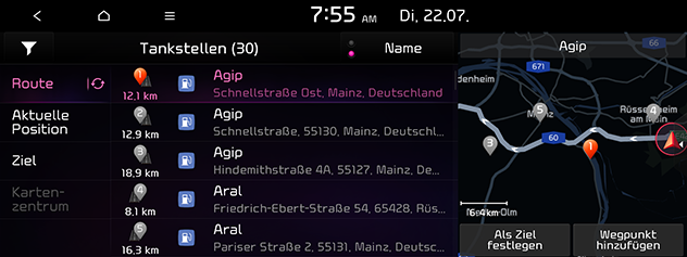 Aktuelle Position: Sucht nach den Tankstellen in der Nähe der aktuellen Fahrzeugposition.