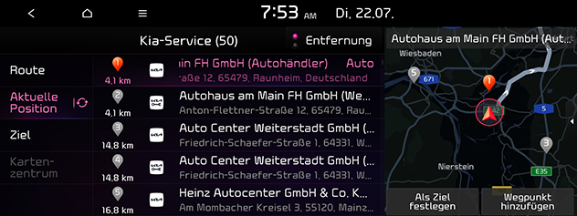 Sie können eine KIA-Servicestation als Ziel setzen. Je nach Modell, Option und Land können sich manche Bildelemente vom tatsächlichen Bildschirminhalt unterscheiden.