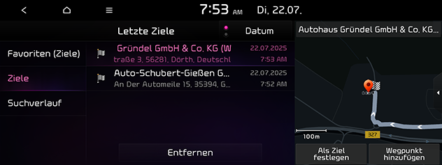 Drücken Sie auf NAV > Letzte Ziele und wählen Sie die Unterkategorie aus.