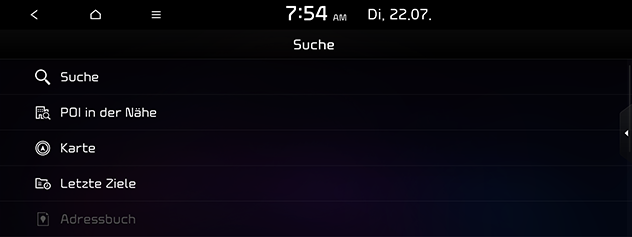 Sie können das Ziel suchen, indem Sie verschiedene Menüs dazu nutzen. Einige Menüpunkte stehen nur dann zur Verfügung, wenn das Navigationssystem mit dem Mobilfunknetz verbunden ist. Je nach Modell, Option und Land können sich manche Bildelemente vom tatsächlichen Bildschirminhalt unterscheiden.