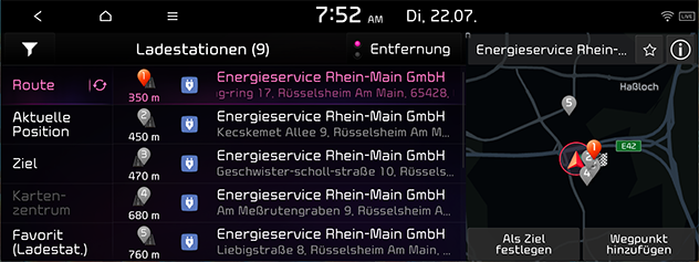 Drücken Sie auf NAV > POI in der Nähe > Ladestationen.