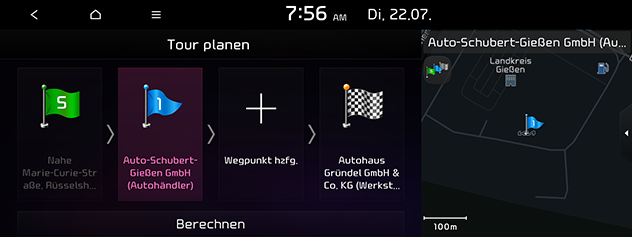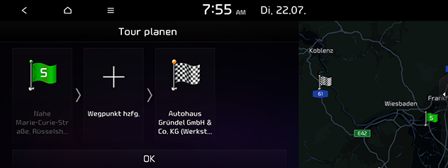 Sie können eine Reiseroute planen, indem Sie einen Tour-Punkt suchen und die aktuelle Route bearbeiten. Sie können Wegpunkte hinzufügen, löschen, bearbeiten oder ihre Reihenfolge ändern.