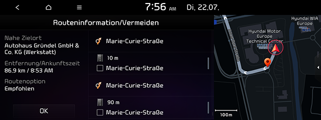 Routeninfo/Vermeid.-optionen: Zeigt die Routeninformationen und Straßen an, die Sie meiden können.