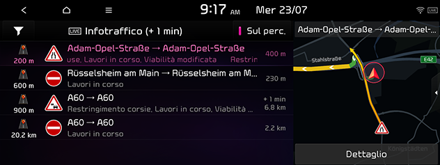 Le informazioni attuali su eventi di traffico/strada vengono visualizzate in sintesi nell'elenco delle informazioni sul traffico. A seconda delle condizioni, questa funzione potrebbe non produrre risultati.