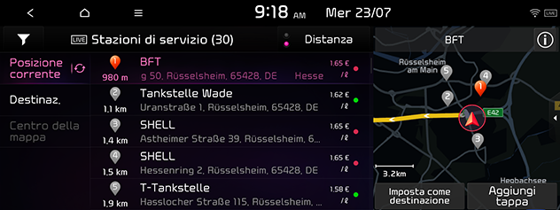 Destinaz.: Cerca le stazioni di servizio in funzione in prossimità della posizione corrente del veicolo.