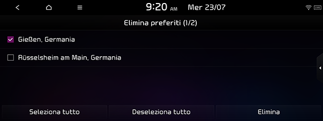 ] > Kia LIVE > Meteo > Preferiti > Elimina.