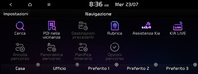 Destinaz.: Cerca i servizi Kia in prossimità della destinazione corrente. Disponibile solo quando è impostata la destinazione.