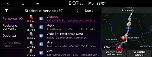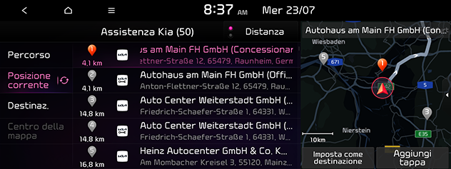Percorso: Cerca i servizi Kia lungo il percorso corrente. Disponibile solo quando è impostata la destinazione.