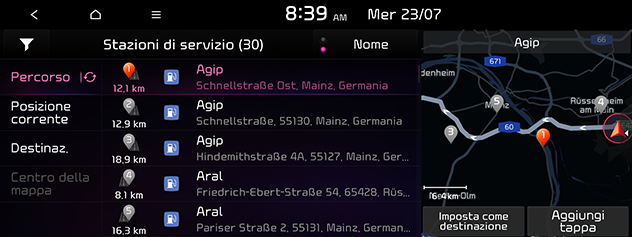 Destinaz.: Cerca le stazioni di servizio in prossimità della destinazione corrente.