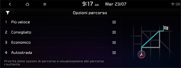 È possibile modificare varie opzioni del percorso in base alle proprie esigenze. Assicurarsi che il sistema sia connesso alla rete. Opzioni percorso è disponibile solo quando è impostata la destinazione.
