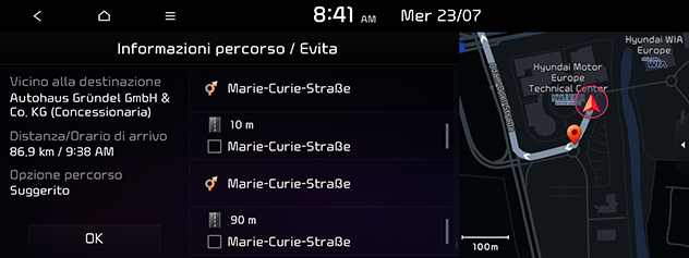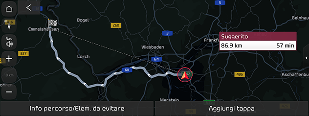 Info percorso/Elem. da evitare: Visualizza le informazioni sul percorso e le strade che si può scegliere di evitare.