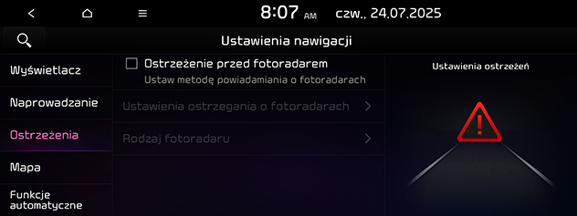 Ustawienia ostrzegania o fotoradarach: Dostosowuje ustawienia alertów kamery.