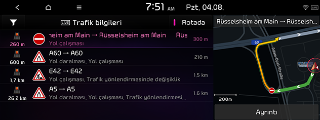 Mevcut trafik/yol bilgileri temel olarak trafik bilgi listesinde görüntülenir. Bu işlev, koşullara bağlı olarak yansıtılmayabilir.