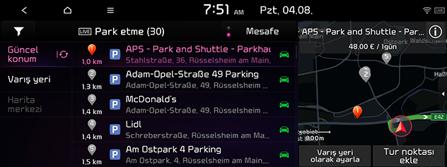 Farklı arama yöntemlerini kullanarak bir otoparkı varış noktası olarak ayarlayabilirsiniz.
