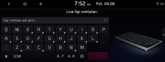 Kia LIVE, kullanıcıların araç navigasyon sistemlerinde çevrimiçi ağ üzerinden ek bilgi almalarını sağlar. Kullanmadan önce Kia LIVE'ın etkin olduğunu kontrol edin.