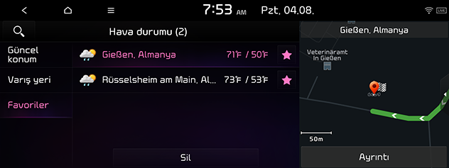 ] > Kia LIVE > Hava durumu > Güncel konum, Varış yeri veya Favoriler sekmelerine basın.