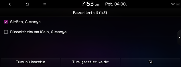 ] > Kia LIVE > Hava durumu > Favoriler > Sil sekmelerine basın.