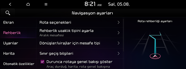 Durunca rotaya genel bakışı göster: Duruş halindeyken gösterilecek rota genel bakış bilgisini ayarlar.