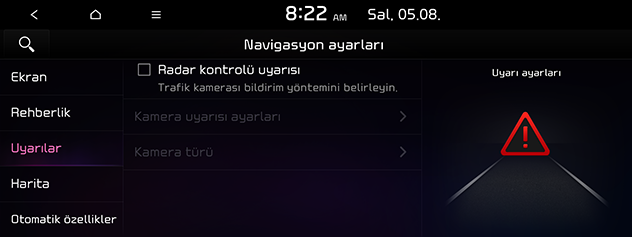 Radar kontrolü uyarısı: Kamera uyarısını etkinleştirmek için ayarlar.