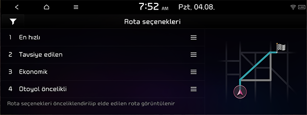 Çeşitli rota seçeneklerini ihtiyaçlarınıza göre değiştirebilirsiniz. Sistemin şebekeye bağlı olduğundan emin olun. Rota seçenekleri yalnızca varış noktası ayarlıysa kullanılabilir.