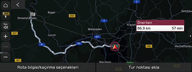 Bir sonraki yönlendirme noktasına olan mesafeyi ve bu yönlendirme noktasındaki dönüş yönünü görüntülemenizi sağlar. Ve trafik koşulları nedeniyle bazı sokakların yok sayılmasını sağlar. Araç konumundan varış noktasına alternatif bir rota hesaplayabilirsiniz.