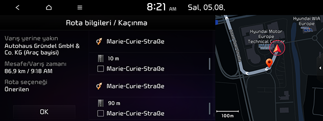 Rota bilgileri / Kaçınma seçenekleri: Rota bilgilerini ve yok saymayı seçebileceğiniz sokakları görüntüler.