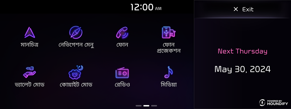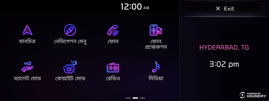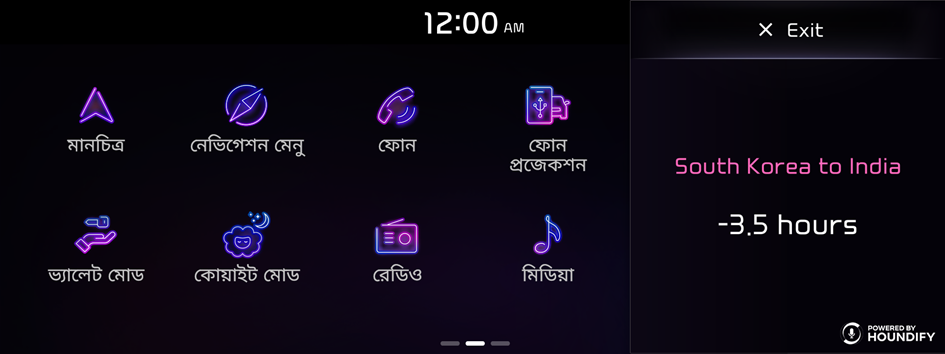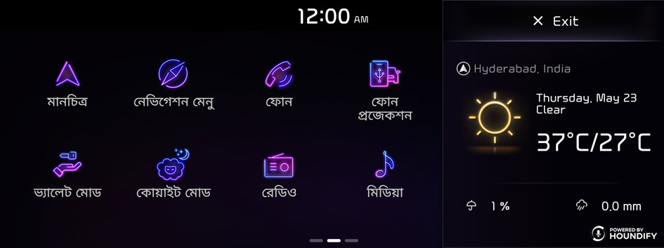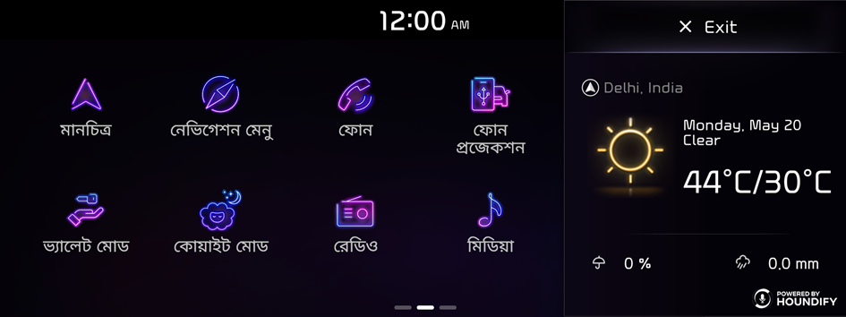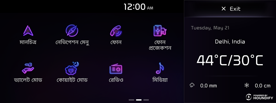 Heat up / I am feeling cold | गरम करें. | যদি ATC<26 ডিগ্রি (80°F) হয়, তাপমাত্রা 26 ডিগ্রি (80°F) সেট করুন এবং অটো চালু করুন এবং চালকের সীট ওয়ার্মার চালু করুন এবং স্টিয়ারিং হুইল গরম করুন। যদি ATC>=26 ডিগ্রি (80°F) হয়, তাপমাত্রা উচ্চে সেট করুন এবং অটো চালু করুন এবং চালকের সীট ওয়ার্মার চালু করুন এবং স্টিয়ারিং হুইল গরম করুন। |