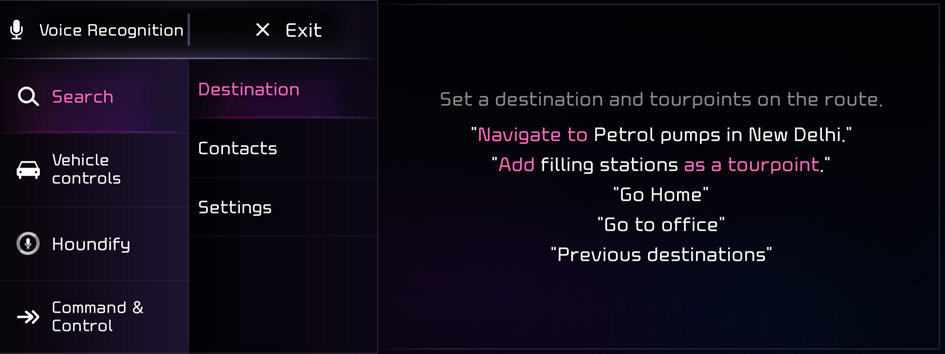 Navigate to POI | फ़िलिंग स्टेशन {ढूँढें}. | আপনি নিকটবর্তী POI-এর একটি নির্দিষ্ট শ্রেণী সন্ধান করতে পারেন। উদাহরণস্বরূপ, বলুন "Navigate to Agra"। |