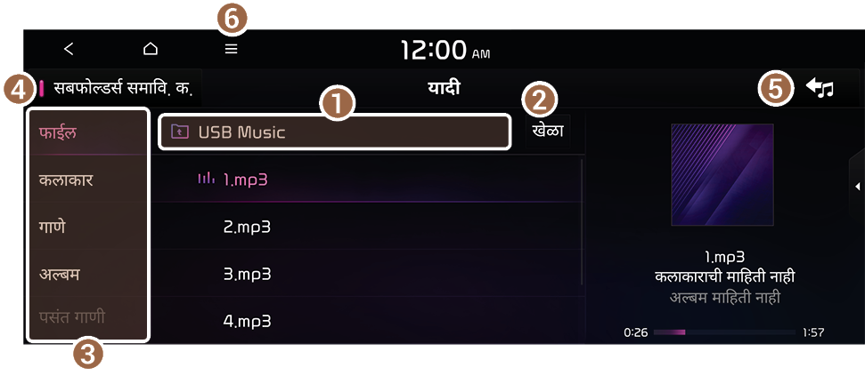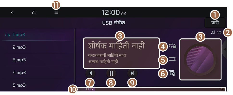 तुम्ही USB संगीत प्लेबॅक स्क्रीनवर यादी दाबून यादीमधून इच्छित संगीत शोधू आणि प्ले करू शकता.
