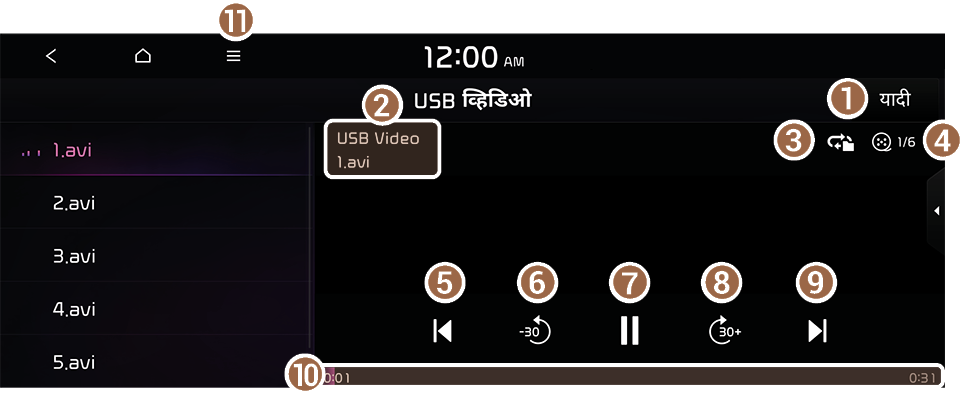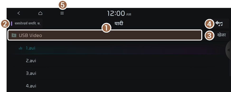 तुम्ही USB व्हिडिओ प्लेबॅक स्क्रीनवर यादी दाबून यादीमधून इच्छित व्हिडिओ शोधू आणि प्ले करू शकता.
