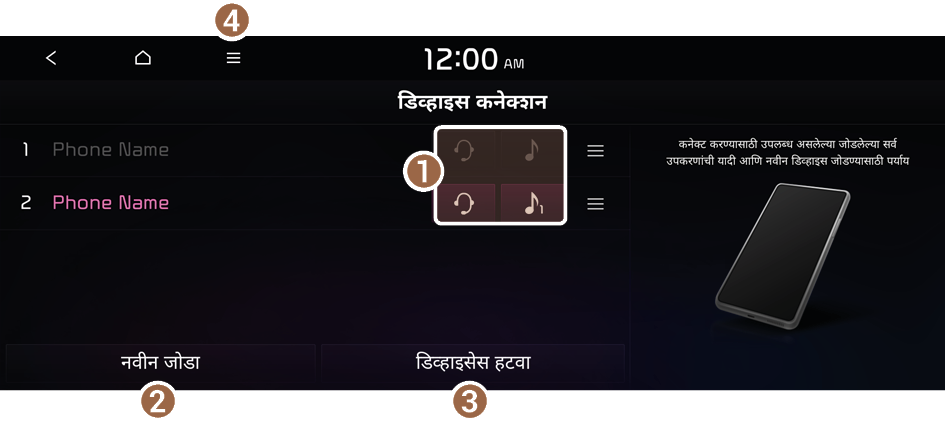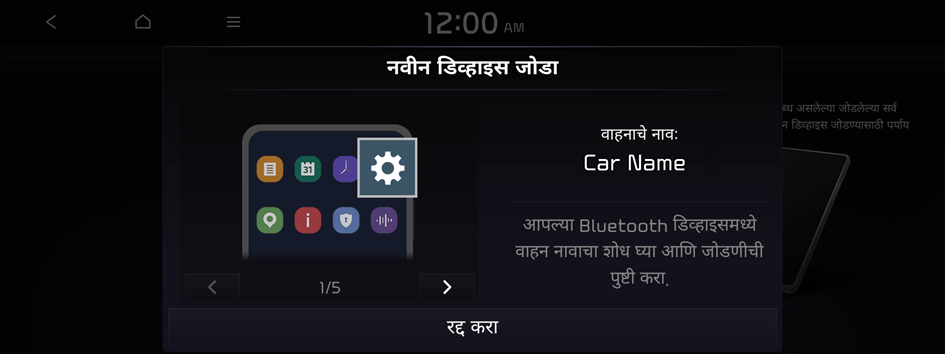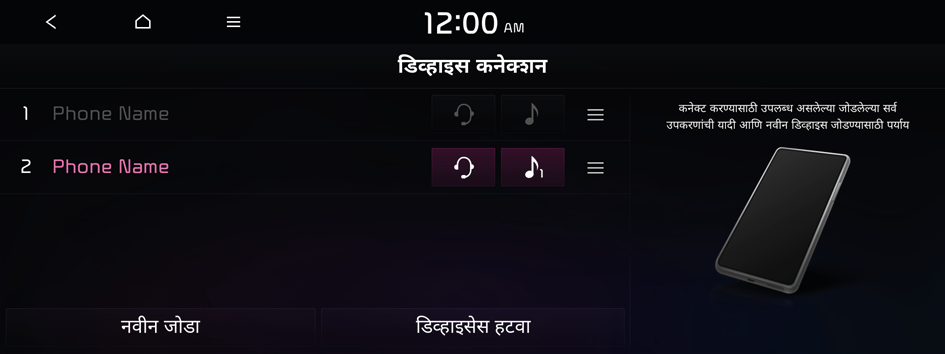सिस्टिमला ब्ल्यूटूथ उपकरण जोडण्यापूर्वी वाहन सुरक्षित ठिकाणी पार्क करा. यामुळे चालकाचे लक्ष रस्त्यापासून दूर जाऊ शकते आणि वाहतूक अपघात होऊ शकतो ज्यामुळे नुकसान, जखम आणि/किंवा मृत्यू होऊ शकतो.