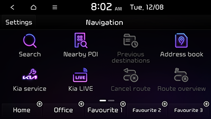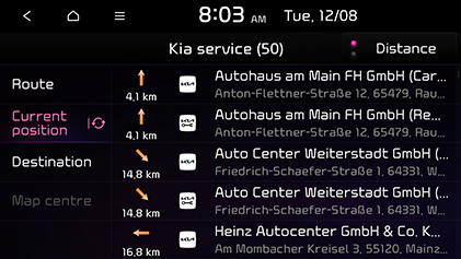 Route: Searches for Kia services along the current route. Available only when the destination is set.