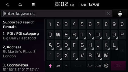 Enter the keyword such as POI, POI category, address, and coordinates and press OK.