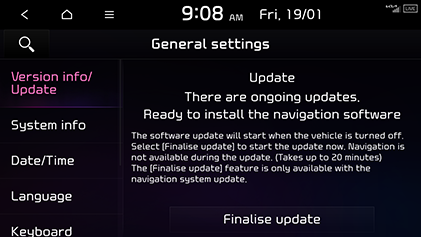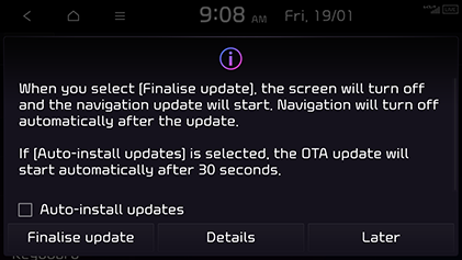 Update is performed with the screen off after the vehicle is turned off. If you turn on the system when update is in progress, you can see the progress of update.