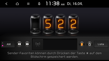 Drücken Sie auf DAB/FM oder FM, um das Band auf AM-Radio umzuschalten, wenn das Radioband auf DAB (ausstattungsabhängig)/FM eingestellt ist. Der Sender, den Sie zuletzt gehört haben, wird angezeigt.