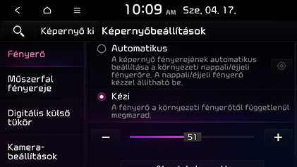 Képernyőbeállítások: Beállítja a nappali és éjszakai fényerőt és a kontrasztot.