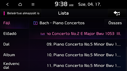 A kategóriák Fájl, Előadó, Dal, Album vagy Kedvenc dal lehetőségek szerint rendezhetők.