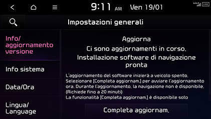 Quando la batteria del veicolo è al di sotto di un determinato livello, Completa aggiornam. è disabilitato e l’aggiornamento del sistema non è disponibile.