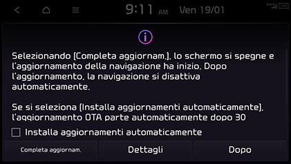 Eseguire l’aggiornamento quando il veicolo non viene usato per più di 15 minuti. Il tempo necessario per aggiornare il sistema varia a seconda della situazione.