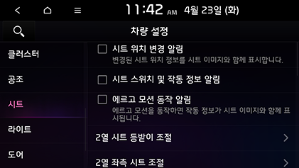 SETUP > 차량 > 시트를 누르십시오.