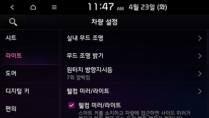 웰컴 라이트: 스마트 키를 소지한 상태로 차량에 접근하면 퍼들 조명 또는 도어 핸들 조명이 켜지도록 설정합니다.