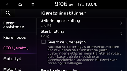 Veiledning om rulling: Kystfartveiledningen hjelper føreren med å spare drivstoff ved å anbefale når han skal fjerne foten fra gasspedalen. Du kan velge Lyd På eller Lyd Av.