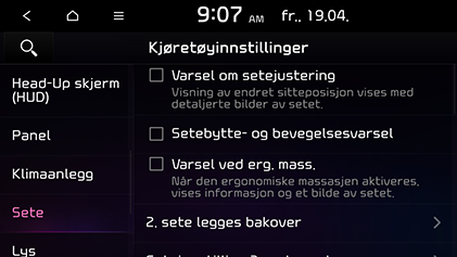 Komfort setetilgang: Velger setets bevegelsesavstand når føreren setter seg inn i kjøretøyet eller forlater kjøretøyet. Du kan velge Maksimal, Normal eller Av.
