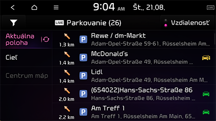Aktuálna poloha: Vyhľadá funkčné parkoviská v blízkosti aktuálnej polohy vozidla.
