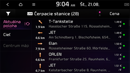 Aktuálna poloha: Vyhľadá funkčné čerpacie stanice v blízkosti aktuálnej polohy vozidla.